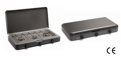 Table stove with 3 stainless steel high-power burners. Complete with cover and removable chromed grill for easy cleaning operation. It works with Butane, Propane or LPG.