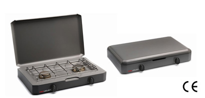 Table stove with 2 stainless steel high-power burners. Complete with cover and removable chromed grill for easy cleaning operation. It works with Butane, Propane or LPG.
